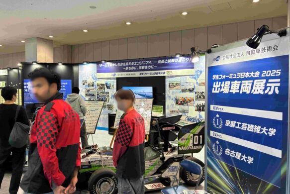 EV部門優勝の名古屋大学、エンジン部門優勝の京都工芸繊維大学がそろって展示してありました。