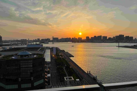 夕方から宿に向かい、最上階の温泉で東京湾の夕日を眺めて癒されました。