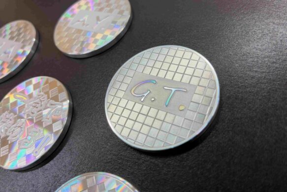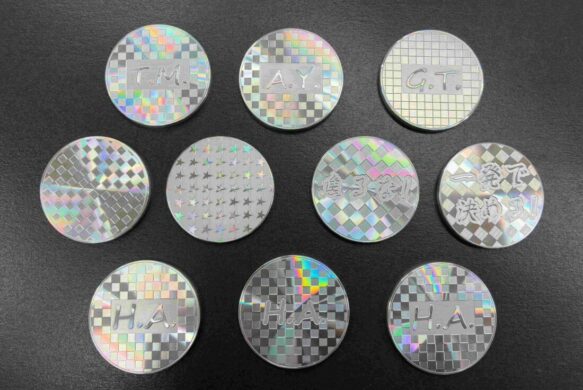 旋削加工にて車用ホイールでおなじみの「ダイヤモンド・カット」を施して虹面を出し、好きな模様や文字を彫り込みます!
